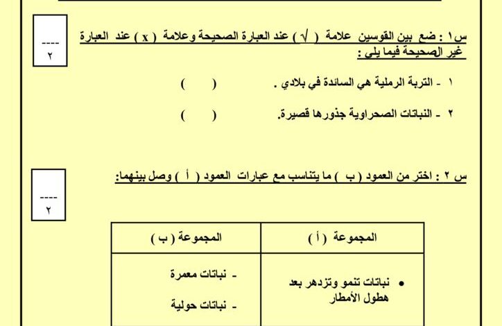 علوم || اختبار تحديد مستوى على الوحدة الاولى || للصف الثالث || الفصل الثاني
