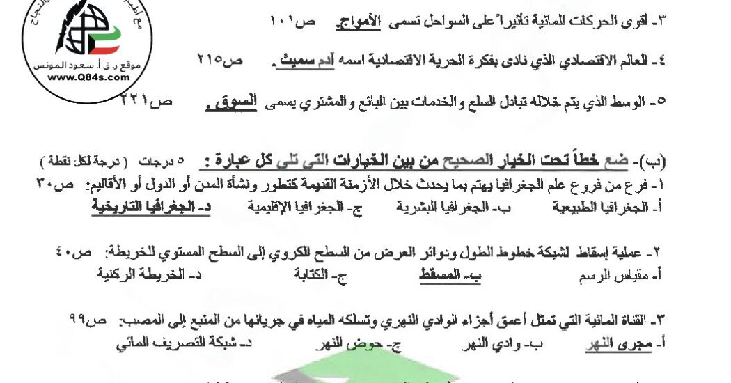 امتحان نهائي جغرافيا و اقتصاد للصف الحادي عشر أدبي الفصل الأول # مع نموذج الإجابة