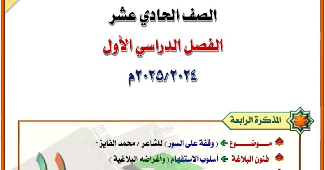 مذكرة العشماوي درس (وقفة على السور) عربي حادي عشر فصل أول مذكرة العشماوي لدرس "وقفة على السور" في منهج اللغة العربية للصف الحادي عشر لفصل الأول تتناول موضوعات مهمة تتعلق بالهوية والانتماء. يتناول النص مشاعر الحنين والذكريات المرتبطة بالمكان، مما يعكس عمق التجربة الإنسانية وأثرها في تشكيل الوعي الفردي والجمعي، مع التركيز على جمال اللغة […]