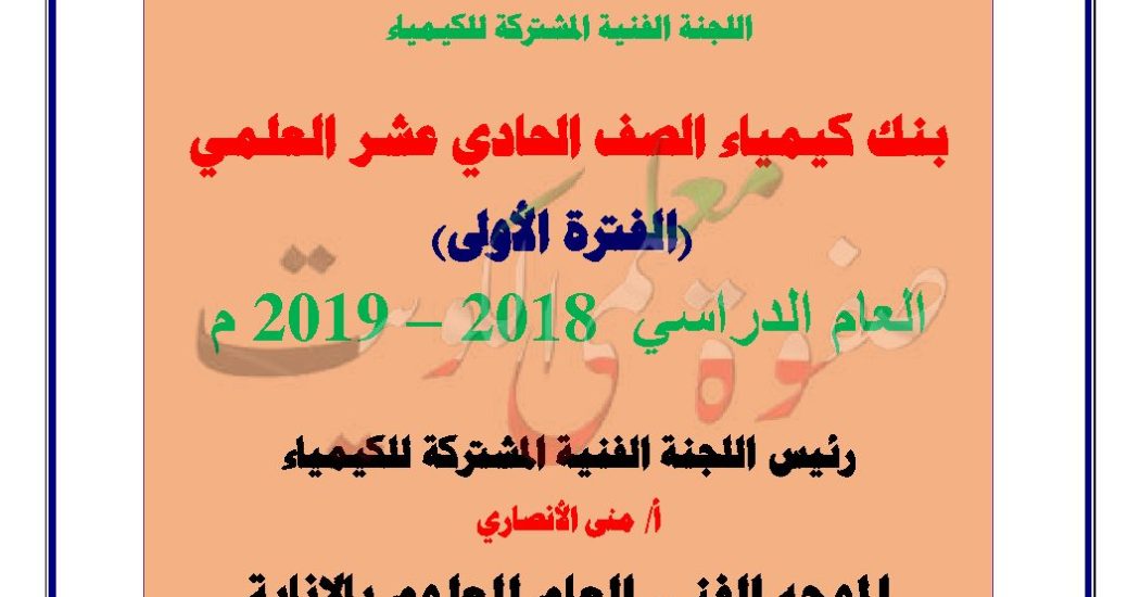 الصف الحادي عشر || الكيمياء || حلول / أجابة بنك أسئلة الكيمياء للفصل الدراسي الأول قد يهمك: الصف الحادي عشر || الكيمياء || بنك أسئلة الكيمياء للفصل الدراسي الأول
