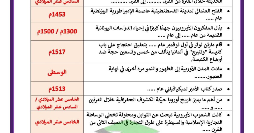 أهم التواريخ و الأحداث تاريخ للصف الثاني عشر أدبي فصل أول