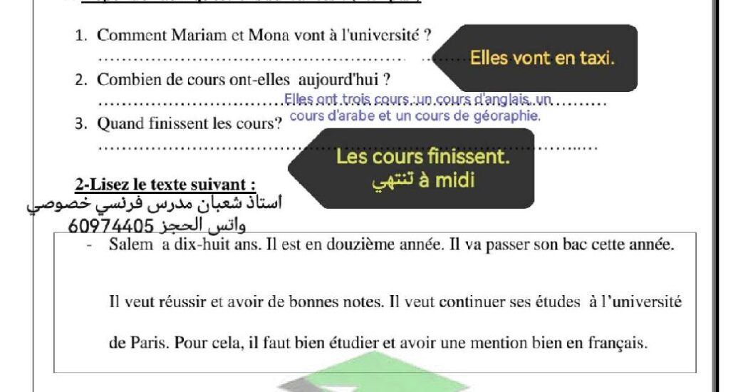 نموذج اختبار قصير محلول فرنسي للصف الثاني عشر أدبي الفصل الاول