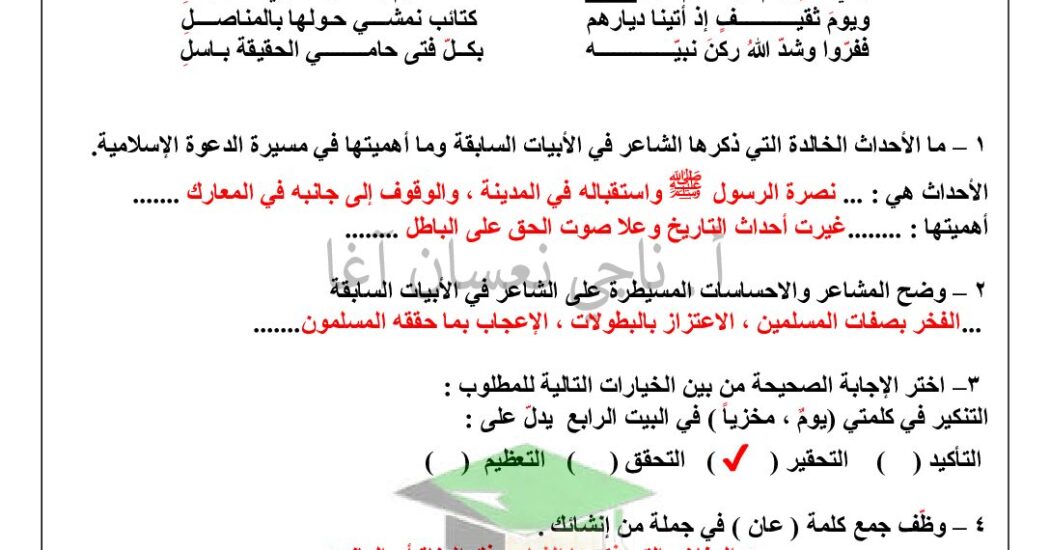 مذكرة العشماوي قصيدة (من يعدل الأذناب بالذرا) عربي ثاني عشر فصل أول
