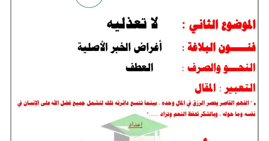 مذكرة شرح درس (لا تعذلية) عربي ثاني عشر فصل أول# أ. حمادة ماهر تُقدِّم مذكرة شرح درس "لا تعذلي" للصف الثاني عشر، الفصل الأول، التي أعدها أ. حمادة ماهر، استكشافًا عميقًا لأفكار الحب والشعور بالندم. يتناول الدرس قصيدة تُسلط الضوء على المشاعر الإنسانية المعقدة، مثل الحب الفاشل واللوم الذاتي. تحتوي المذكرة على تحليل لجوانب النص […]